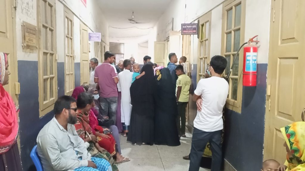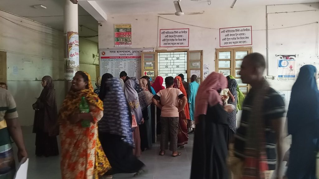 বুধবার (৮ অক্টোবর) সকালে চুয়াডাঙ্গা সদর হাসপাতাল ঘুরে দেখা গেছে, নতুন ও পুরোনো ভবনের দ্বিতীয় তলার করিডোর ও বারান্দাজুড়ে উপচেপড়া রোগীর ভিড়। চিকিৎসকদের কক্ষের সামনে লম্বা লাইন, ভেতরে প্রবেশের অপেক্ষায় অসংখ্য রোগী। ভিড় সামলাতে হিমশিম খাচ্ছেন হাসপাতালের কর্মীরা।