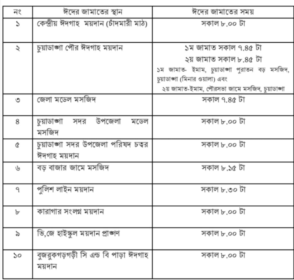 চুয়াডাঙ্গা শহর ও আশপাশের এলাকার ঈদ-উল ফিতরের জামাতের সময়সূচি নির্ধারণ করেছে জেলা প্রশাসন।