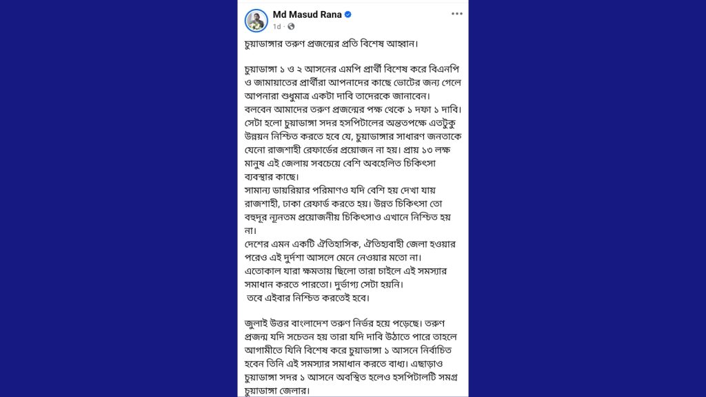 তিনি বলেছেন, আসন্ন নির্বাচনে চুয়াডাঙ্গা-১ ও ২ আসনের প্রার্থীরা ভোট চাইতে এলে তরুণদের স্পষ্টভাবে বলতে হবে- সমর্থন চাইলে প্রথম শর্ত হবে, বিজয়ী হওয়ার এক বছরের মধ্যেই সদর হাসপাতালের কাঙ্ক্ষিত উন্নয়ন সম্পন্ন করতে হবে।