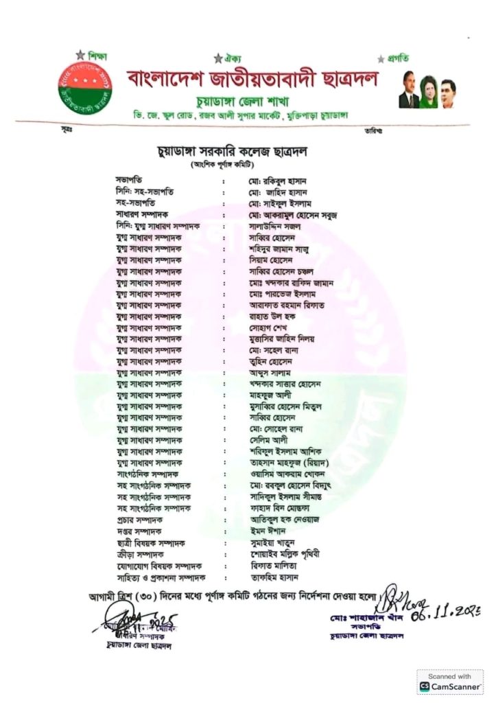 বাংলাদেশ জাতীয়তাবাদী ছাত্রদল, চুয়াডাঙ্গা জেলা শাখার অধীনে চুয়াডাঙ্গা সরকারি কলেজ ছাত্রদলের আংশিক পূর্ণাঙ্গ কমিটি ঘোষণা করা হয়েছে।