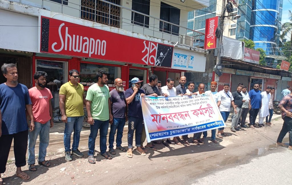 আজ রোববার (২৯ জুন) বেলা ১টার দিকে চুয়াডাঙ্গা প্রেসক্লাবের সামনে চুয়াডাঙ্গার সর্বস্তরের ব্যবসায়ীরা এই মানববন্ধন কর্মসূচি আয়োজন করেন।