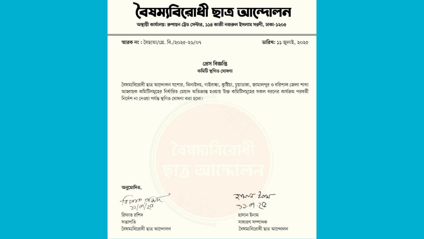 বৈষম্যবিরোধী ছাত্র আন্দোলনের চুয়াডাঙ্গা জেলার আহ্বায়ক কমিটির কার্যক্রম স্থগিত