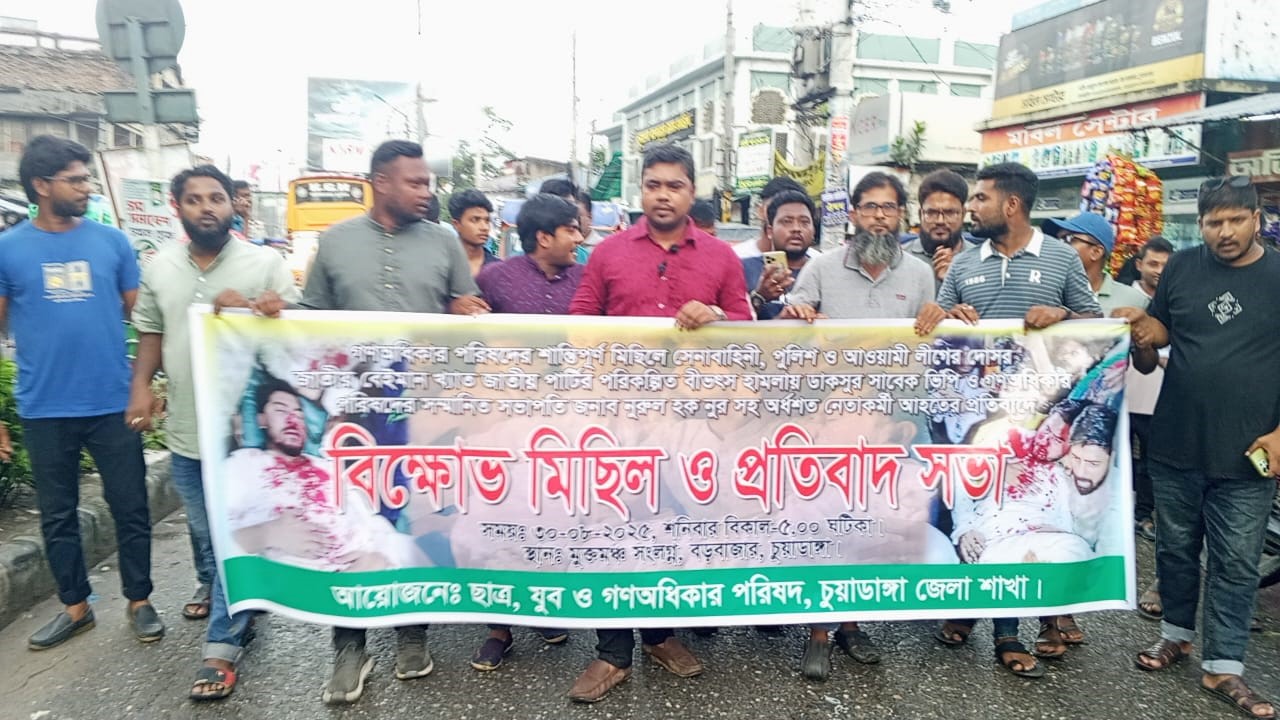ডাকসুর সাবেক ভিপি ও গণঅধিকার পরিষদের সভাপতি নূরুল হক নূরসহ অর্ধশতাধিক নেতাকর্মীর হামলাত প্রতিবাদে চুয়াডাঙ্গায় বিক্ষোভ মিছিল ও প্রতিবাদ সভা